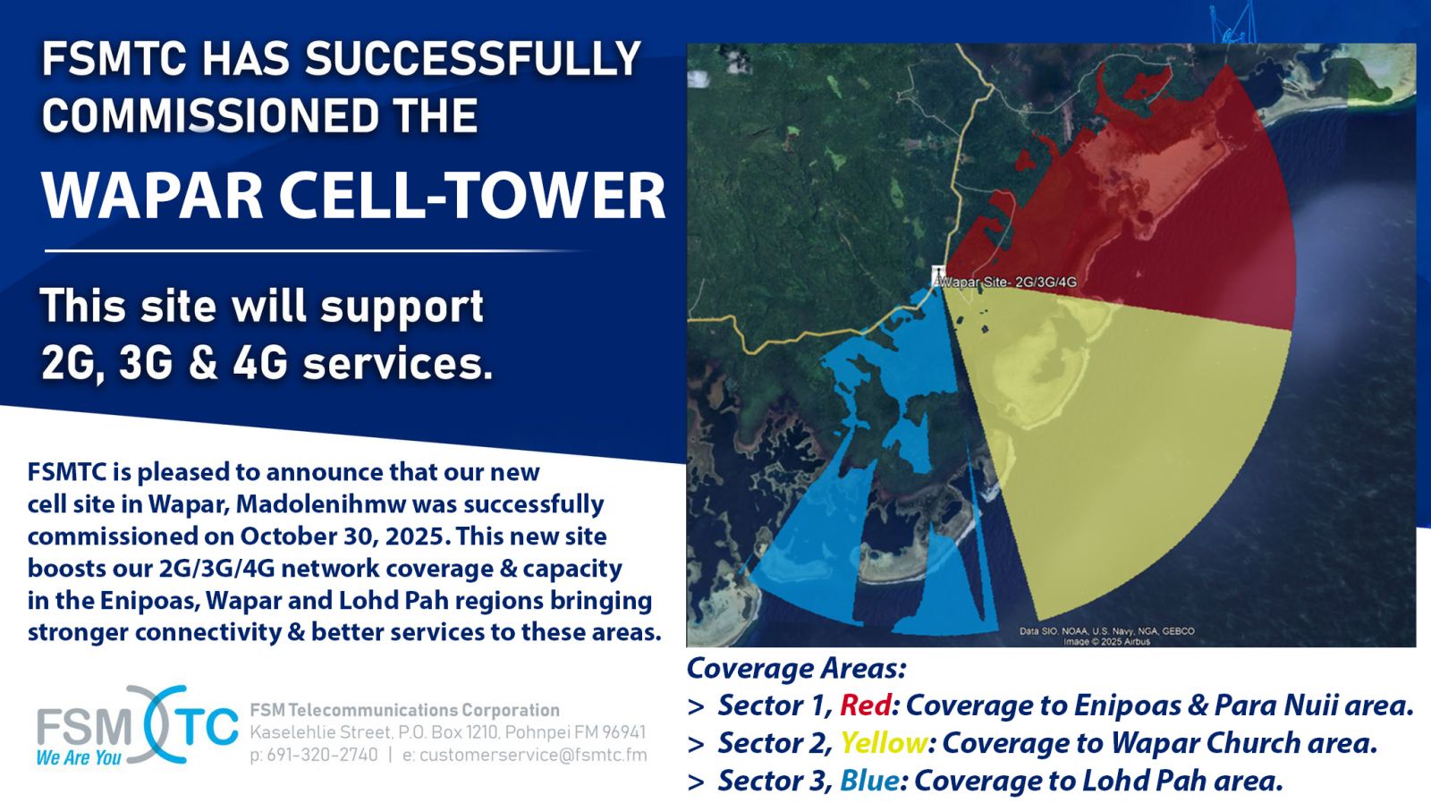 FSMTC is pleased to announce that our new cell site in Paies, Kitti was successfully commissioned on October 8, 2025. This new site boosts our 2G/3G/4G network coverage in parts of Palikir, College of Micronesia and all of inner Paies, bringing stronger connectivity and better service by improving signal strength and data speeds to these areas.