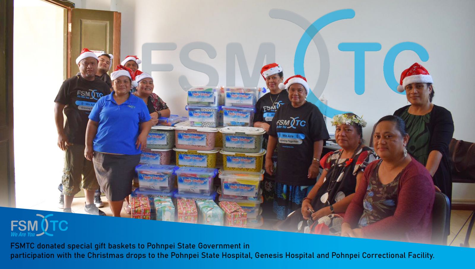 Kolonia, Pohnpei - On Thursday, November 26, 2021, FSM Telecom donated gift baskets filled with basic toiletries such as soap, toothpaste, shampoo, towels and other necessities to the Pohnpei State Government. FSMTC answered a request seeking support for a Christmas drop to raise donations for patients at the Pohnpei State Hospital, Genesis Hospital, and Pohnpei Correctional Facility.
