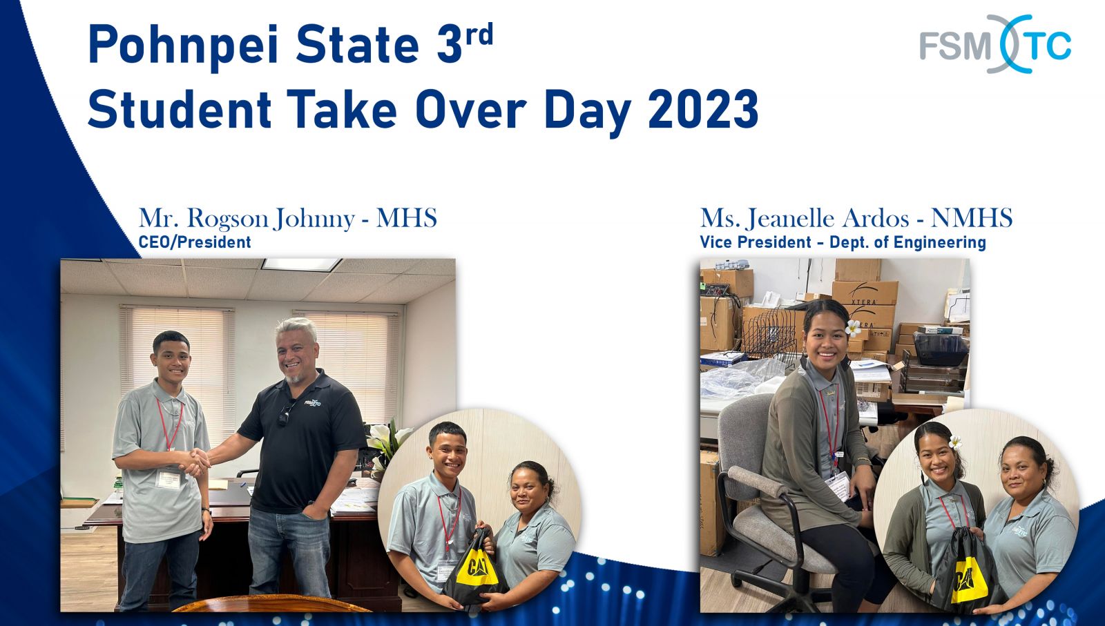 FSMTC participated in the Pohnpei State 3rd Student Take Over Day.Top high school students has been selected by the Pohnpei State Department of Education to take over roles in government, organizations and other agencies for one day.FSMTC CEO/President Johnny and Vice President of Engineering Ardos took over, participated and experienced what it's like to be part of the FSMTC team.